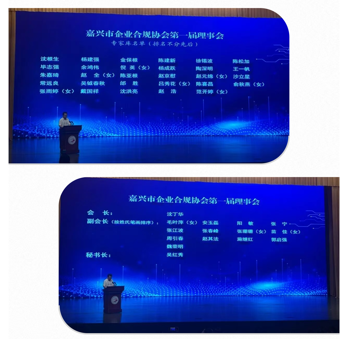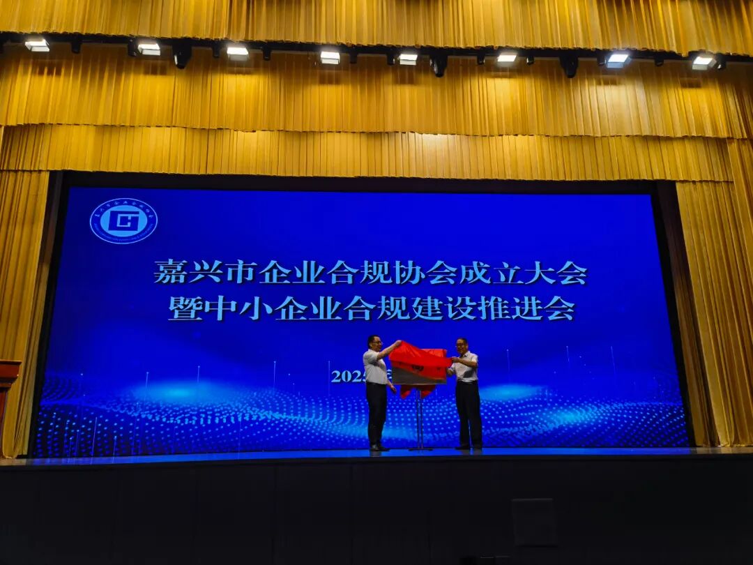 会上宣布了嘉兴市企业合规协会会长、副会长、名誉会长、顾问、秘书长和协会专家成员。并由嘉兴市人大常委会副主任沈红雷,嘉兴市企业合规协会第一届理事会名誉会长、长三角(嘉兴)专精特新企业服务基地主任宁金彪为嘉兴市企业合规协会揭牌。