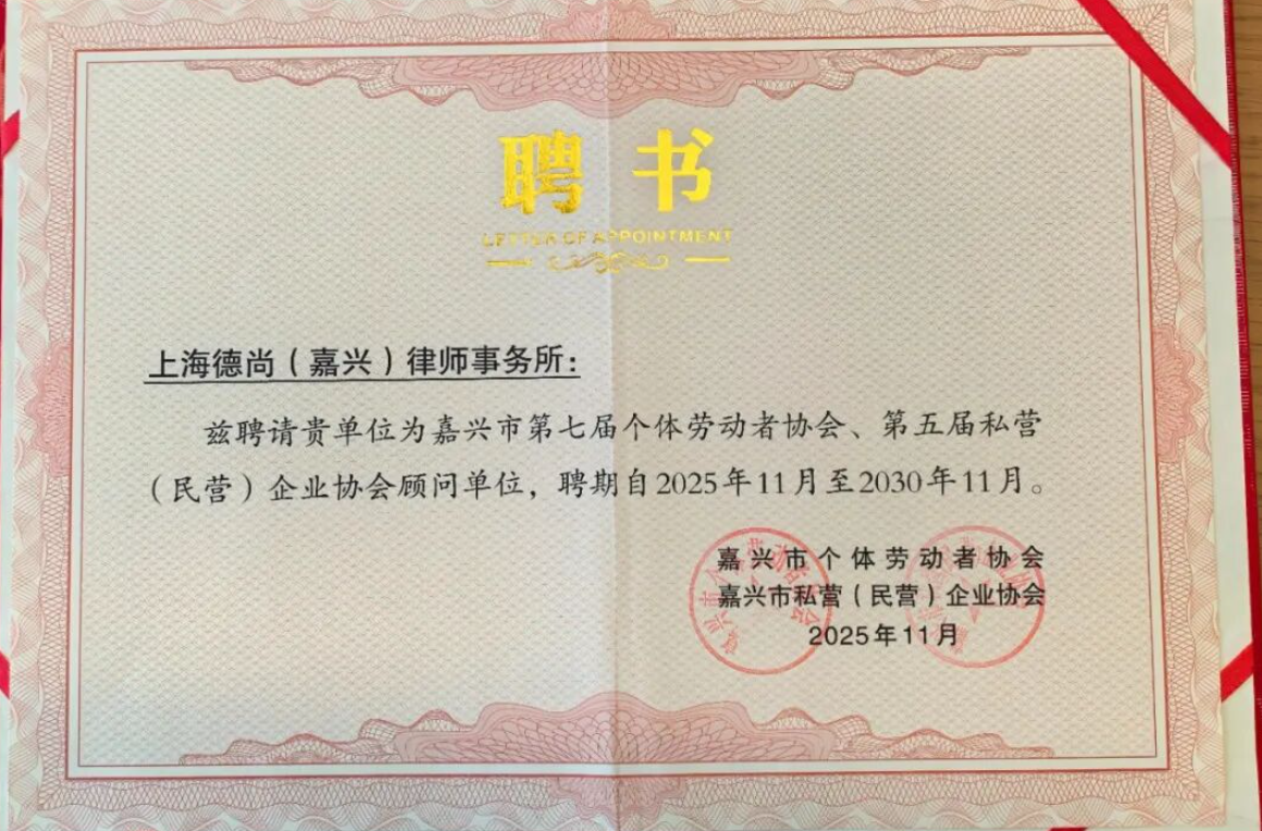 2025 年 11 月5日,嘉兴市个体劳动者协会第七次、私营(民营)企业协会第五次会员代表大会隆重召开。上海德尚(嘉兴)律师事务所凭借专业的法律服务能力和深厚的行业积淀,正式受聘为嘉兴市第七届个体劳动者协会、第五届私营(民营)企业协会顾问单位,聘期自 2025 年 11 月至 2030 年 11 月。