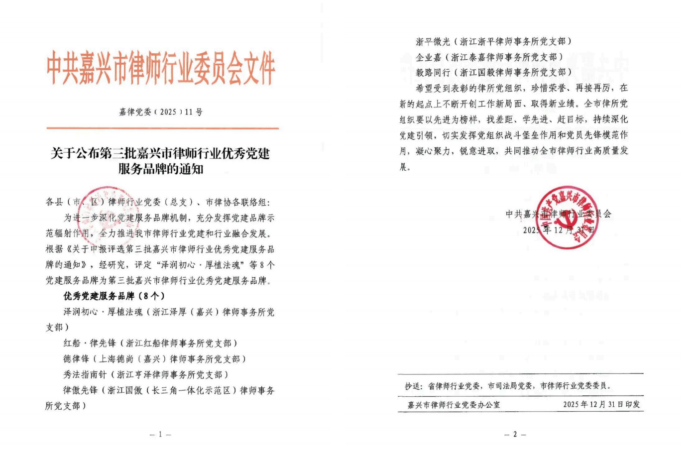 2025年12月31日,中共嘉兴市律师行业委员会公布第三批“嘉兴市律师行业优秀党建服务品牌”评选结果,共有8个品牌入选,本所党支部创建并申报的“德律锋”党建品牌成功入选。